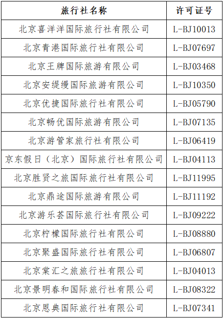本期新增北京鼎途国际旅游有限公司、北京游乐荟国际旅行社有限公司、北京柠檬国际旅行社有限公司、北京恩典国际旅行社有限公司,连续两周进入北京市旅行社投诉前十五名。我局将从9月5日开始,暂停上述旅行社北京市旅游团队电子行程单系统备案权限。